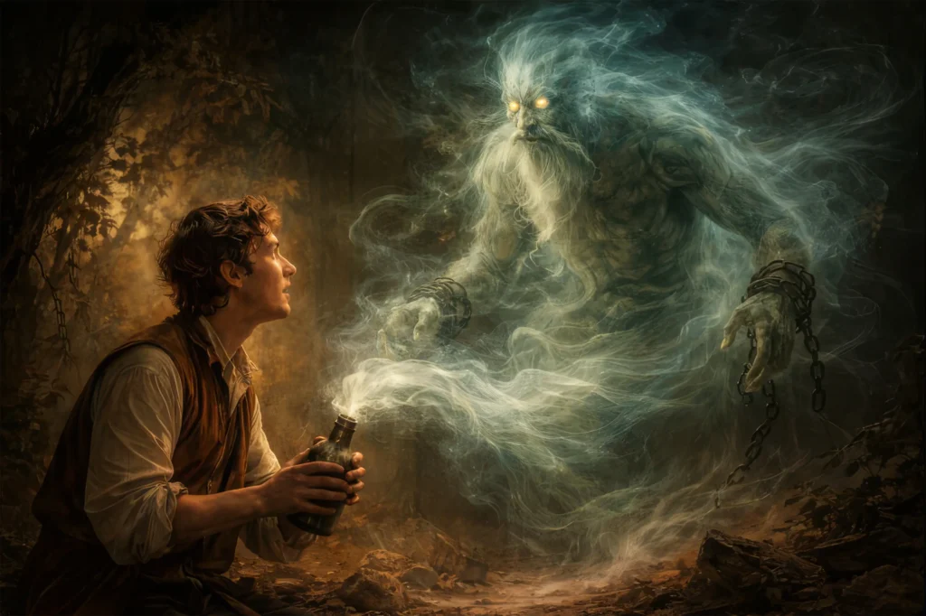 El motivo del espíritu encerrado no solo aparece en los relatos orientales ni se limita a la antigüedad. También atraviesa la tradición literaria europea y llega incluso a la literatura del siglo XX, conservando una estructura sorprendentemente coherente. Un buen ejemplo clásico es el cuento El espíritu en la botella, recopilado por los Hermanos Grimm, donde el encierro de la entidad es presentado como un castigo y la liberación como un acto peligroso. En este relato, el espíritu no agradece haber sido liberado: amenaza directamente al joven que lo ayuda, llegando a anunciar que lo matará. El mensaje es claro y nada infantil: el espíritu estaba embotellado por una razón, y sacarlo no implica beneficio alguno para quien lo hace.