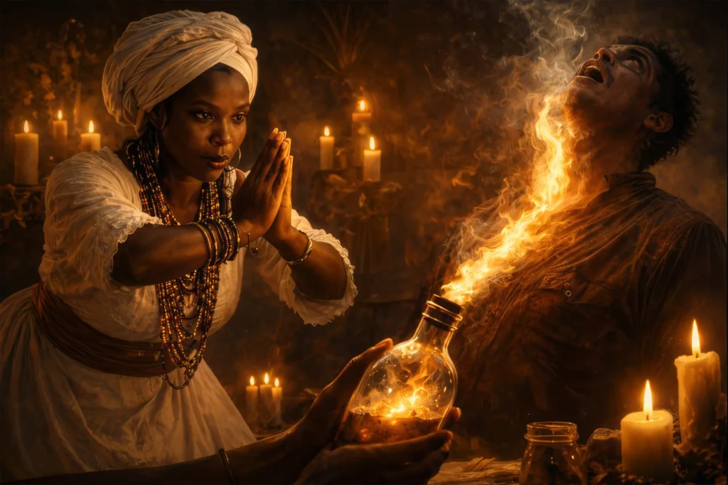 En religiones de raíz africana —algunas de ellas aún practicadas hoy en el Caribe— existe la idea de que un espíritu, conocido comúnmente como “muerto”, puede llegar a poseer a una persona. Cuando esa entidad se niega a abandonar el cuerpo, el ritual no siempre es conciliador. En ciertos casos, el espíritu es expulsado por la fuerza y confinado en un recipiente físico, normalmente una botella.